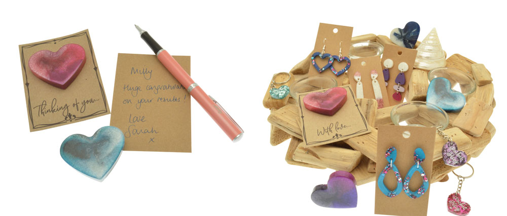 “I’m delighted to be working with Miss Milly and this is my first foray into wholesale, says Michelle. “The magnetic hearts are a product that we have designed together to be given on a sentiment card, and are a great keepsake item, which can be displayed using the magnet or stood on their edge. The pocket hugs sold really well during Lockdown and the earrings are where I began my creative journey. All the items make great letterbox gifts.â€