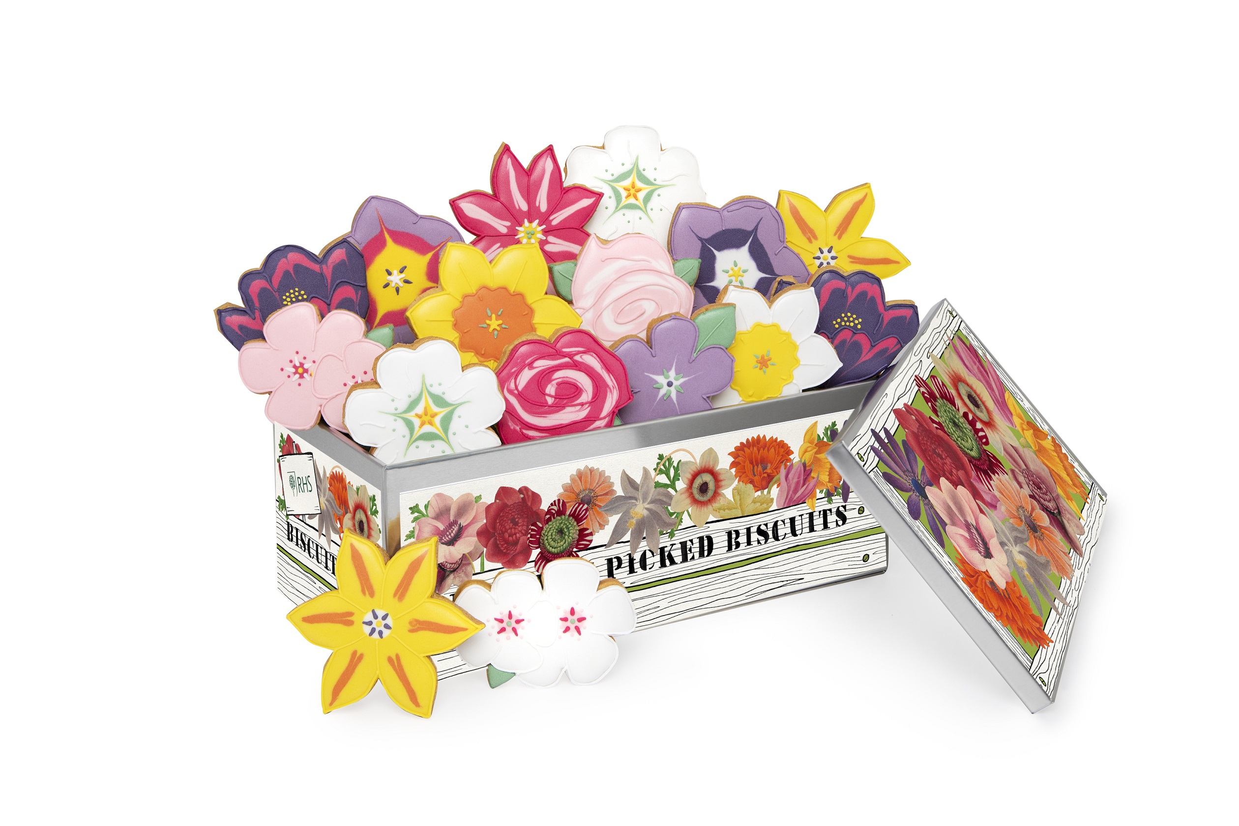 And the tins are special too. For the keepsake tins Biscuiteers has created a beautiful co-branded design, bringing together Biscuiteers’ famous illustrations with beautifully detailed botanical illustrations from the RHS Lindley Collections, the world’s finest collection of botanical art. RHS branding is featured on the tin decals.