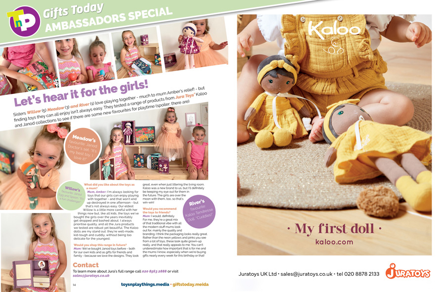 Our Ambassadors Special. And you will love this – if you’ve not come across the Ambassadors in Toys ’n’ Playthings, it’s where young children and their parents get to play with, comment on and effectively review a product. Jura Toys is the happy plaything this time around.