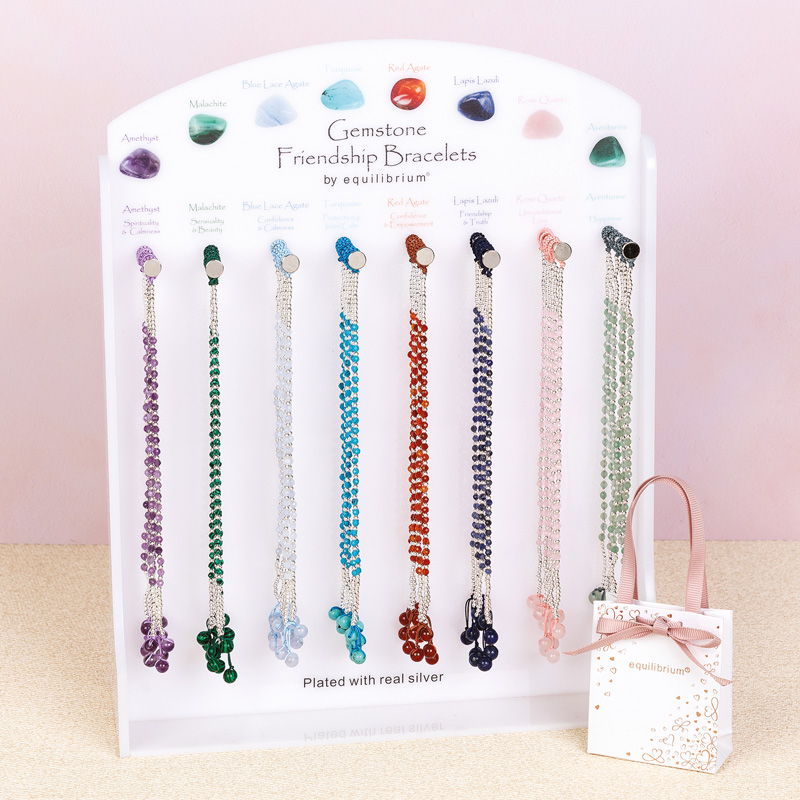 The collection includes eight designs, such as Amethyst and Malachite, with displays highlighting each stone’s attributes. Every bracelet comes with an Equilibrium gift bag, making them ideal for gifting.