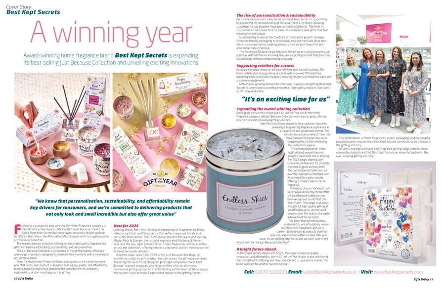 OUR FRONT COVER STAR: is the award-winning home fragrance brand Best Kept Secrets, which is expanding its best-selling Just Because Collection and unveiling exciting innovations