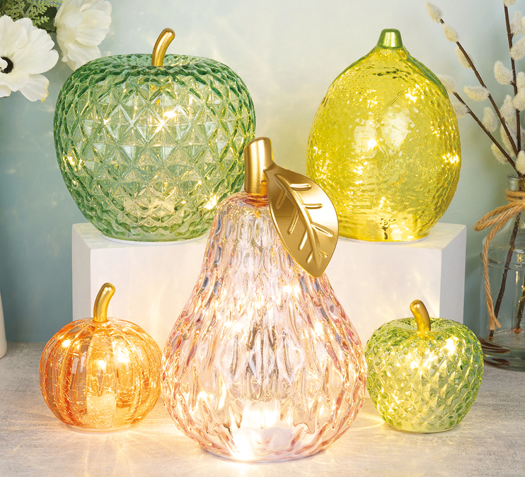 Launched at Home & Gift, these sculptural glass pieces – in the shapes of apples, pears, pumpkins, and lemons – blend tactile texture with ambient LED lighting to create an irresistible display item or gift.
